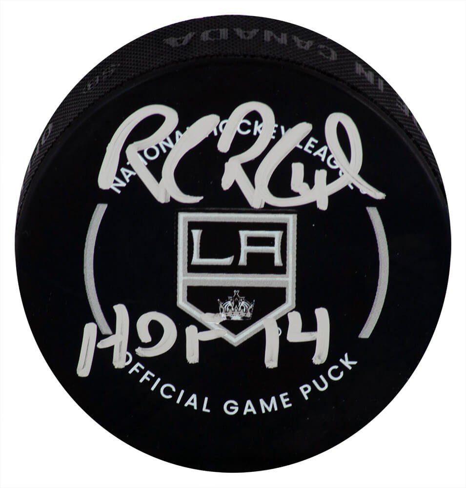 Rob Blake signed Los Angeles Kings logo official hockey puck with 'HOF 14' inscription. Item comes with a Schwartz Sports Memorabilia tamper-proof numbered hologram and Certificate of Authenticity which can be verified online.
