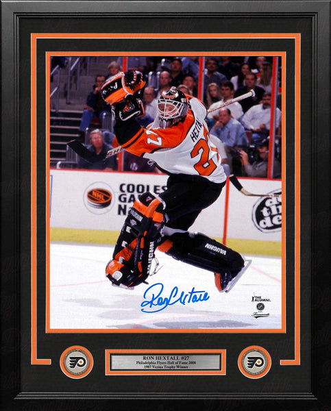 Signed picture of Flyers goalie legend Ron Hextall; authenticated by Dynasty Sports during a public autograph event on June 21, 2025This photo has been hand-signed by Philadelphia Flyers goalie legend Ron Hextall. It has been authenticated by Dynasty Sports during a public autograph appearance.Hand-Signed by Philadelphia Flyers legend Ron HextallSignature is bold and clear on the photoAuthenticated by Dynasty Sports serially-numbered hologram; guaranteed to pass JSA or PSA authentication Framing is professional qualityFramed 16" x 20" measures 22" x 26"