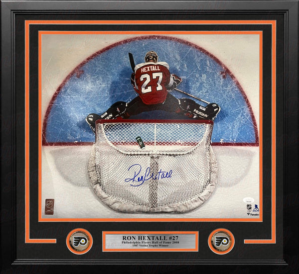 Officially licensed signed picture of Flyers great Ron Hextall; authenticated by James Spence Authentication (JSA)This officially licensed photo has been hand-signed by Flyers goalie legend Ron Hextall. It has been authenticated by JSA.Hand-Signed by Philadelphia Flyers legend Ron HextallSignature is bold and clear on the photoAuthenticated with JSA serially numbered hologramFraming is professional qualityFramed 16" x 20" photo measures 22" x 26"