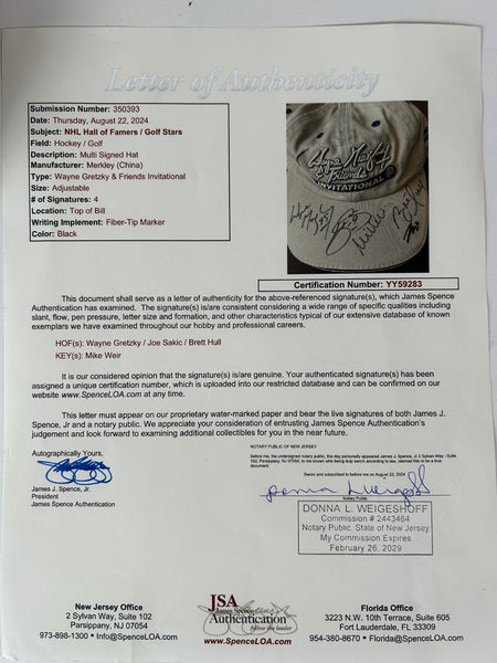 Legendary Multi-Signed Golf Cap - Wayne Gretzky & Friends Own an extraordinary piece of sports history with this Wayne Gretzky & Friends golf cap featuring four legendary signatures. This exceptional collectible showcases autographs from hockey legends Wayne Gretzky, Joe Sakic, Brett Hull, and Canadian golf champion Mike Weir, all professionally authenticated by James Spence Authentication (JSA). Hall of Fame Signatures Wayne Gretzky - "The Great One," NHL's all-time leading scorer and hockey icon Joe Sakic - Colorado Avalanche legend and two-time Stanley Cup champion Brett Hull - Hall of Fame sniper with 741 career NHL goals Mike Weir - Masters Tournament champion and Canadian golf legend Authentication & Quality JSA Letter of Authenticity - Professional authentication guarantees all signatures Official Wayne Gretzky & Friends Invitational Tournament cap Premium golf cap construction with embroidered details Lightweight at 3 pounds for easy display Rare multi-signature collectible from exclusive golf event Perfect For: Hockey Hall of Fame collectors Wayne Gretzky memorabilia enthusiasts Multi-sport collectible investors Golf and hockey fans Premium display in sports rooms or offices Unique gift for sports legends admirers Experience the thrill of owning signatures from four sports legends on one incredible piece. This cap represents the intersection of hockey greatness and golf excellence, capturing a unique moment when these icons came together for charity and friendship. JSA Letter of Authenticity included. Ships with protective packaging to preserve this investment-grade collectible.