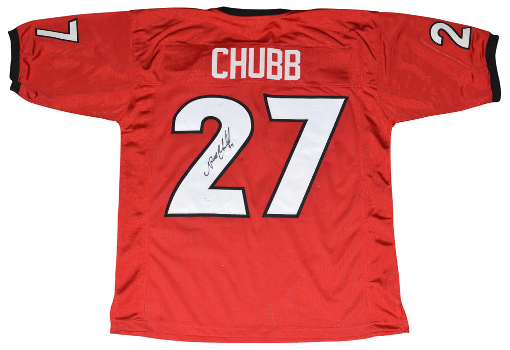 Nick Chubb, former All-American running back for the Georgia Bulldogs, has hand signed this red custom jersey at a private signing. Jersey is size XL and all letters/numbers are sewn-on. This item comes with a certificate of authenticity (COA) from JSA - James Spence Authentication and was signed in the presence of one of their representatives. You will receive a serial-numbered COA along with a matching serial-numbered sticker on the jersey. The authenticity can be verified online by entering the serial number.Item pictured may not be the exact item you will receive. It will be similar quality, and we guarantee your satisfaction.