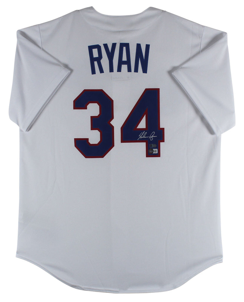 This Autographed White Nike Jersey has been Personally Signed by Nolan Ryan of the Texas Rangers. This item is 100% Authentic to include a hologram by Beckett Authentication Services. This item may come with the new Beckett Authentication hologram that has a scannable QR code rather than the traditional COA. If you would like to have a COA, you are welcome to reach out to Beckett for a printed certification once you receive your item. We conducted an autograph signing with Nolan Ryan where multiples of the same item were signed. While the photographs are representative of this item, the size, placement and strength of the signature may vary. Each item is hand signed, therefore, each autograph is unique. This item can be verified through BAS. Multiple sizes available. Reach out for availability.