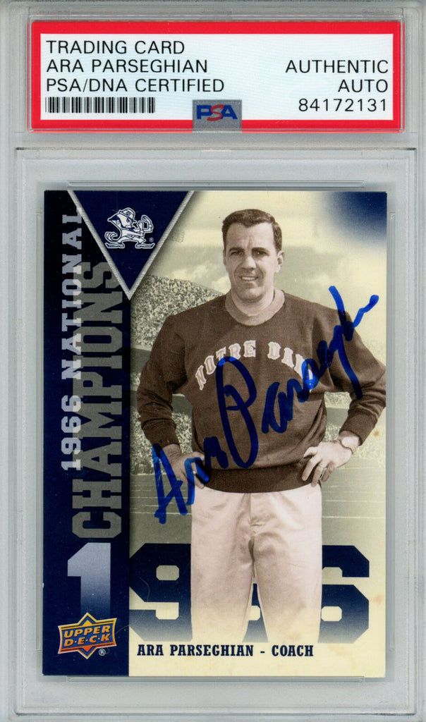 Ara Parseghian Signed 2013 Upper Deck #NC-PA Trading Card PSA Slab 43723 The number in the listing title is just an inventory sku for our records and is not the authentication number. This is the exact item that you will receive so please see pictures for condition. This is a trading card that was personally autographed by Ara Parseghian. This has been professionally slabbed by Professional Authentication Services (PSA) and includes a certificate of authenticity from Denver Autographs.