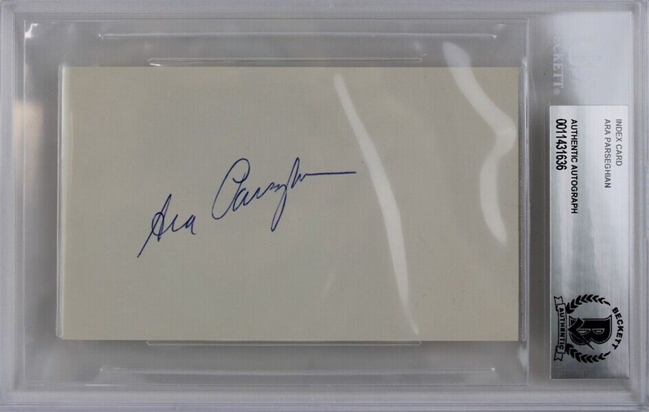 This autographed index card has been personally hand-signed by Ara Parseghian of the Notre Dame Fighting Irish. This autograph is certified by Beckett Authentication Services (BAS). It comes encapsulated and authenticated in the plastic case. Ara Raoul Parseghian May 21, 1923 - August 2, 2017) was an American Football player and coach who guided the Notre Dame Fighting Irish to National Champions in 1966 and 1973. He is noted for bringing Notre Dame's football program from years of futility back into a national contender in 1964 and is widely regarded alongside Knute Rockne and Frank Leahy as a part of the "Holy Trinity" of Notre Dame head coaches.