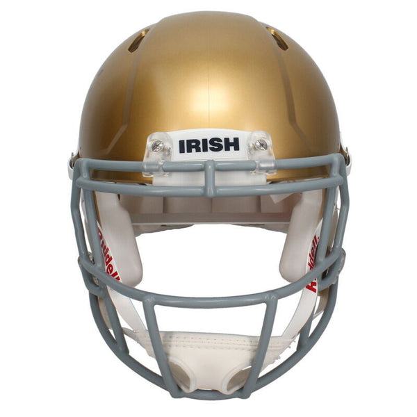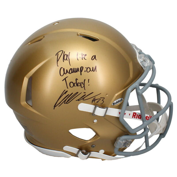 This Notre Dame Fighting Irish authentic speed helmet has been personally hand-signed by Super Sports Center exclusive athlete, Kyren Williams. Kyren added the inscription "Play Like A Champion Today." It comes with an individually numbered, tamper-evident hologram from Beckett Authentic. To ensure authenticity, the hologram can be reviewed online. This process helps to ensure that the product purchased is authentic and eliminates any possibility of duplication or fraud. Also included is the Super Sports Center tamper-evident hologram and Certificate of Authenticity.This helmet is limited to just 23 and you are bidding on a random number from the edition. Kyren Williams is the newest exclusive athlete to the Super Sports Center family.