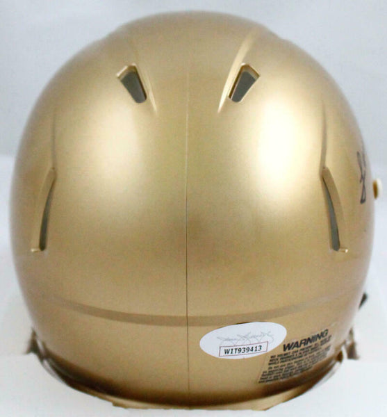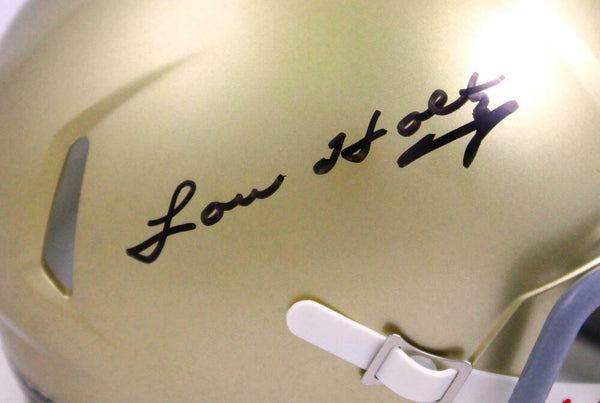 Lou Holtz Autographed Notre Dame Fighting Irish Speed Mini Helmet- JSA W *Black This is a Hand Autographed Helmet of Lou Holtz of The Notre Dame Fighting Irish. This is a Riddell Football Speed Mini Helmet. This item has a James Spence Witness Authentication, which Comes with a JSA #'ed Sticker and a Matching JSA COA. You can view this item on the SpenceLOA website, it shows when and where the item was signed. It was signed either at a public autograph appearance or a Private Signing. This is a stock photo of the item. Although you may not receive this exact item, the item you receive is virtually identical and brand new in great shape.
