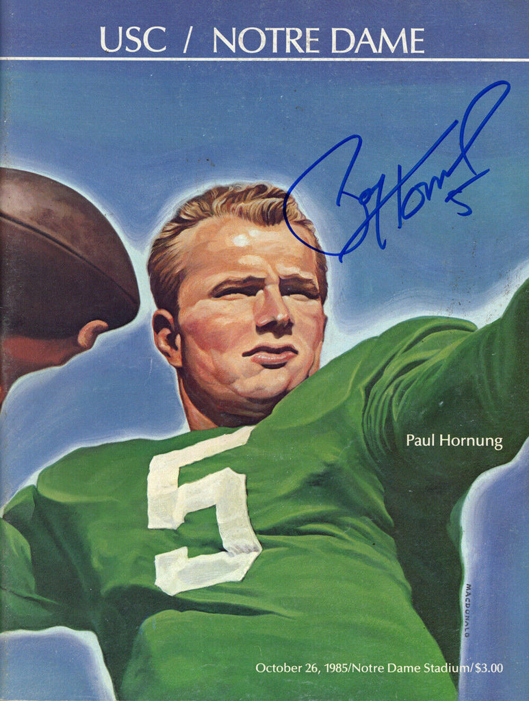 Paul Hornung Autographed 10/26/1985 Notre Dame vs USC Program JSA 38245 The number in the listing title is just an inventory sku for our records and is not the authentication number. This is the exact item that you will receive so please see pictures for condition. This is a 1985 Notre Dame Fighting Irish vs USC Trojans program that was personally autographed by Paul Hornung. Includes a certificate of authenticity from James Spence Authentication (JSA) and Denver Autographs.