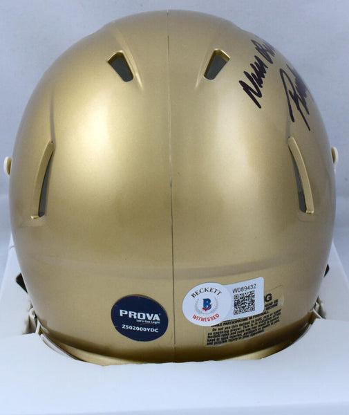 Rudy Ruettiger Signed Notre Dame Riddell Speed Mini Helmet W/Never Quit- Beckett W Hologram *Black This is a Hand Autographed Helmet of Rudy Ruettiger of The Notre Dame Fighting Irish. This is a Riddell Football Speed Mini Helmet. Inscribed Never Quit. This item has a Beckett Witness Authentication, which Comes with a Beckett #'ed Sticker hologram and a QR code for verification. You can view this item on the Beckett website and it shows when and where the item was signed. It was signed either at a public autograph appearance or a Private Signing. This is a stock photo of the item. Although you may not receive this exact item, the item you receive is virtually identical and brand new in great shape.