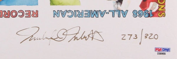 Lithograph measures 11" x 17" and has been hand-signed and inscribed in gold paint pen by O.J. Simpson (HOF). Lithograph is limited edition and has been hand numbered #273/320 and has also been signed by the artist. The lot / autograph(s) includes an official PSA/DNA hologram and matching COA for authenticity purposes.Authentication: PSA COA