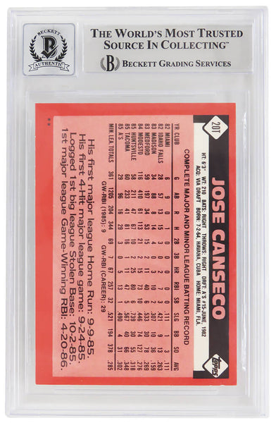 Jose Canseco signed Oakland A's 1986 Topps Traded rookie baseball trading card #20T. The card has been authenticated and encapsulated by Beckett Authentic and the autograph has been graded a Mint 10. The authentication number can be verified online. Only the autograph has been graded a 10 by Beckett Authentic, the card itself is ungraded. The image of the item is a stock photo, as we may have multiples of the item in stock. The Slabbed Card you will receive will be of the card described. (Same grade, Same authentication) You may or may not receive the exact Beckett serial number on the slab label shown in image.