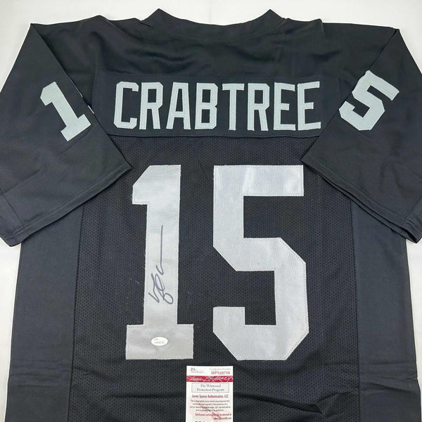 Autographed/Signed Michael Crabtree Oakland Las Vegas Black Jersey JSA COA Jersey has no brand names or logos. This is a custom jersey and was not manufactured by or in any manner associated with any professional sports league or manufacturer. This custom jersey carries no professional sports league designation. The item is intended to be an autographed collectible. The custom jersey displays the name and number of the player. This item in no way is affiliated with or connected to any professional sports organization. Size is XL.
