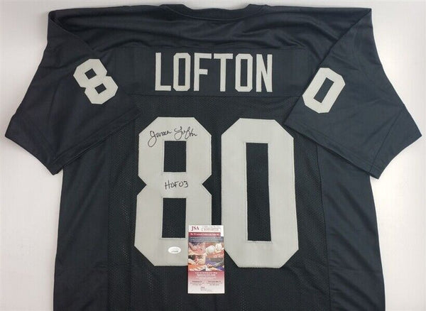 This autographed jersey has been personally hand-signed by James Lofton of the Oakland Raiders. Lofton added the inscription "HOF 03" along with his signature.This autograph is certified by James Spence Authentication's (JSA) Witnessed Protection Program. That means that a JSA representative was present when this item was signed. It comes with the numbered hologram and matching Certificate of Authenticity.