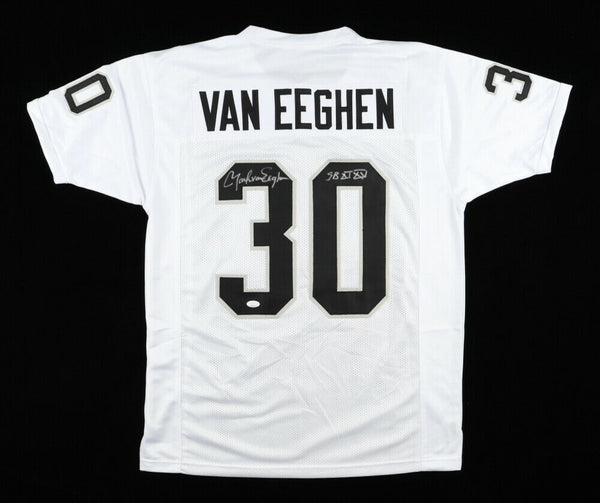Custom on-field style jersey. Everything sewn on, size XL. Hand-signed and inscribed by Mark van Eeghen.The lot / autograph(s) includes an official James Spence Authentication (JSA) hologram and matching COA for authenticity purposes. The signing of this item was witnessed by JSA.Authentication: JSA COA