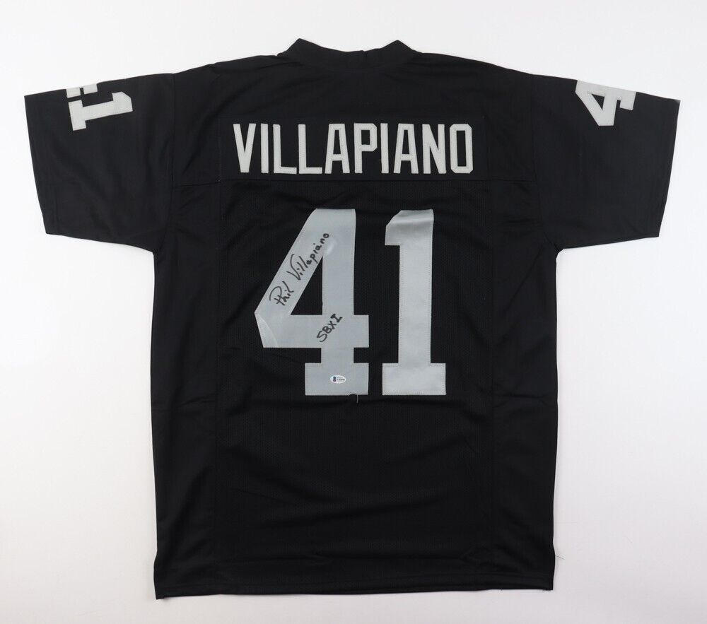 Custom jersey. Everything sewn on, size XL. Has been hand-signed and inscribed by Phil Villapiano. The lot / autograph(s) includes an official Beckett Authentication Services serially numbered hologram for authenticity purposes.Authentication: Beckett Hologram