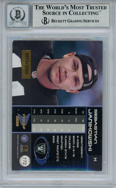 Sebastian Janikowski Signed 2000 Pacific Prizm #172 Trading Card BAS 10 Slab 34997 The number in the listing title is just an inventory sku for our records and is not the authentication number. The item pictured is a stock photo unless otherwise noted. This is a 2000 Pacific Prizm #172 rookie trading card that was personally autographed by Sebastian Janikowski. This has been professionally slabbed by Beckett Authentication Services (BAS) and includes a certificate of authenticity from Denver Autographs.