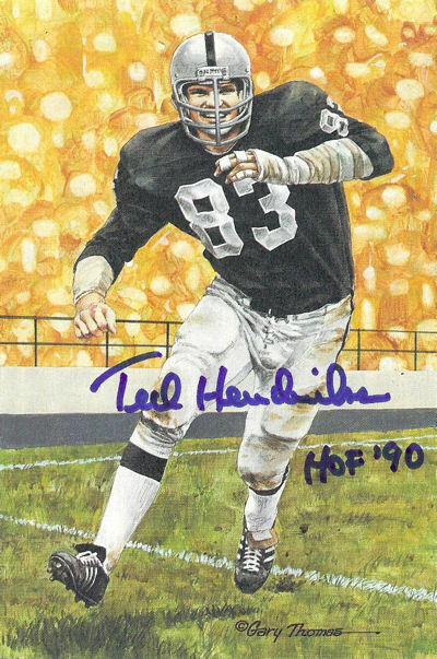 Ted Hendricks Autographed Oakland Raiders Goal Line Art Card Blue HOF 11615 This is a limited edition of 5000, Goal Line Art card which has been personally autographed by in blue sharpie. From the original done by Gary Thomas, card measures 4"x6" and is mint condition. His pass coverage was represented by the 26 interceptions and over 95 passes deflected in his 15 seasons. He was a member of four Super Bowl-winning teams (three with the Raiders and one with the Colts) and was a Pro Bowl selection eight times, at least once with each of his three NFL teams. The seemingly indestructible Hendricks played in 215 straight regular-season games. He also participated in eight Pro Bowl games, seven AFC championships and four Super Bowls. This was signed in Canton, OH on August 4, 2010 and includes a certificate of authenticity from Denver Autographs.