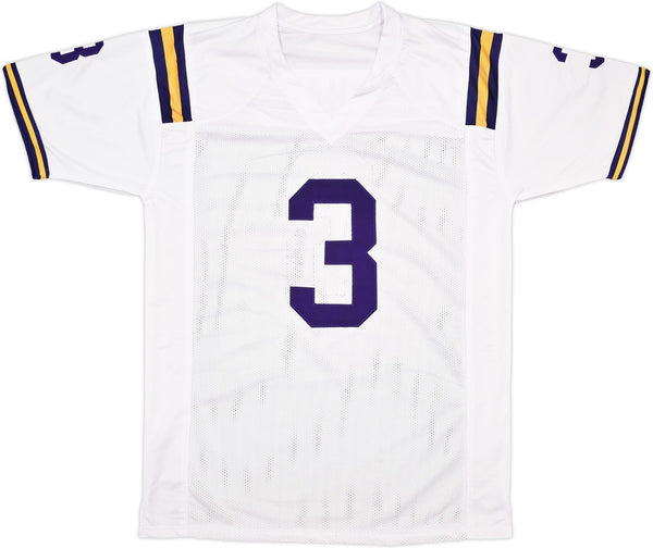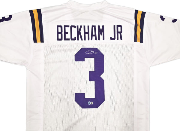 This is a White Jersey that has been hand signed by Odell Beckham Jr. This is a custom jersey with no name brand. The approximate size is XL. It has nice sewn in name and numbers. This item has been witnessed and certified authentic by Beckett Authentication (BAS) and comes with their tamper-proof witness hologram.