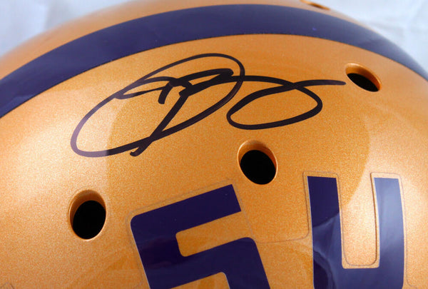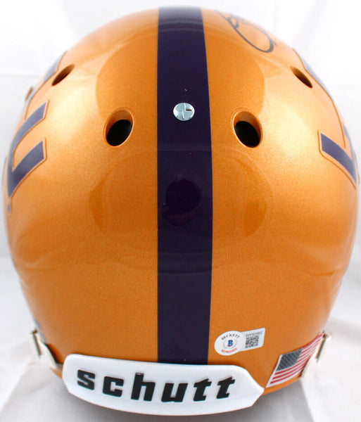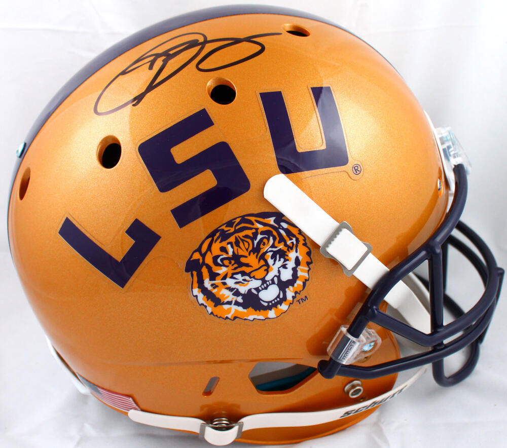 Odell Beckham Jr. Autographed LSU Tigers Gold F/S Schutt Helmet-Beckett W Hologram *Black This is a hand autographed helmet of Odell Beckham Jr. of the Louisiana State University Tigers. This is a Schutt Football Replica Helmet. This item has a Beckett Witness Authentication, which comes with a Beckett numbered sticker hologram and a QR code for verification. You can view this item on the Beckett website and it shows when and where the item was signed. It was signed either at a public autograph appearance or a private signing. This is a stock photo of the item. Although you may not receive this exact item, the item you receive is virtually identical and brand new in great shape.