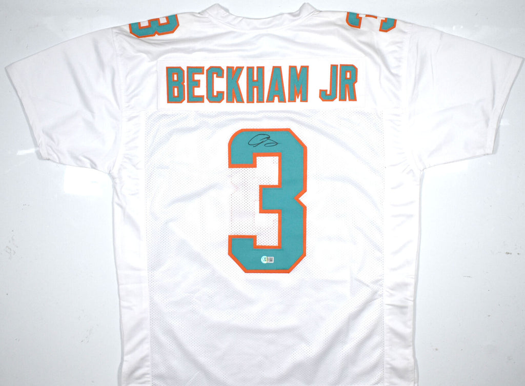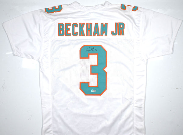 THIS IS NOT AN NFL JERSEY. THIS HAS NO TAGS, NO LOGOS, NO EMBLEMS. This is a hand autograph of Odell Beckham Jr. on a Custom Made (non name brand) Authentic Style Jersey with stitched letters and numbers. This item has a Beckett Witnessed Authentication, which comes with a numbered hologram and a QR code for verification. You can view this item on the Beckett Authentication website and it shows when and where the item was signed. It was signed either at a public autograph appearance or a private signing. This is a stock photo of the item. Although you may not receive this exact item, the item you receive is virtually identical and brand new in great shape. Jersey size is XL. THIS IS NOT AN NFL JERSEY. THIS HAS NO TAGS, NO LOGOS, NO EMBLEMS. This is a hand autograph of Odell Beckham Jr. on a Custom Made (non name brand) Authentic Style Jersey with stitched letters and numbers. This item has a Beckett Witnessed Authentication, which comes with a numbered hologram and a QR code for verification. You can view this item on the Beckett Authentication website and it shows when and where the item was signed. It was signed either at a public autograph appearance or a private signing. This is a stock photo of the item. Although you may not receive this exact item, the item you receive is virtually identical and brand new in great shape. Jersey size is XL.