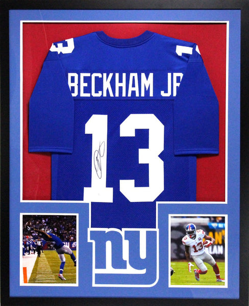 An New York Giants Framed Royal Blue NFL Custom Jersey hand signed by Odell Beckham Jr.. The item and signature are in excellent condition. The framed jersey also features two 8x10 photos. The frame measures 42 x 34. Odell was electric in Death Valley but became a true Superstar in his rookie season! Get in on the action now! - AUTHENTICATION: The item is accompanied by a JSA Certificate of Authenticity - JSA Databased Hologram.