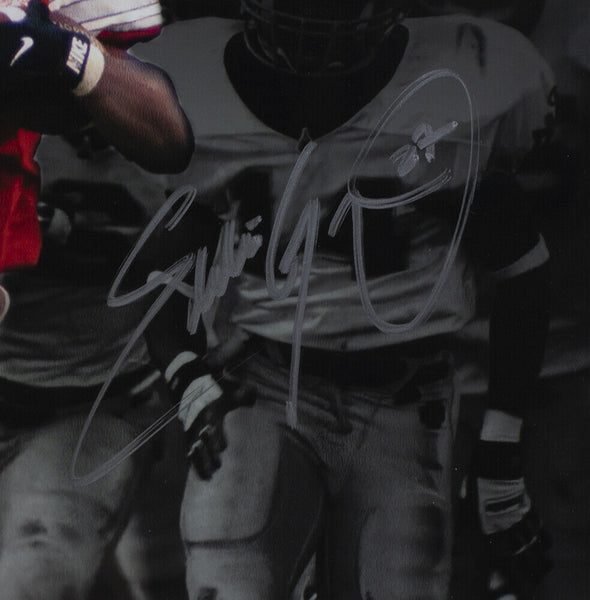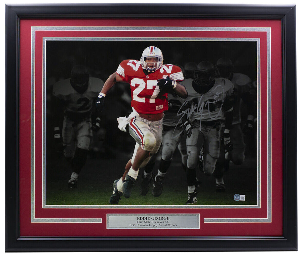 Featured is an Eddie George signed framed 16x20 Ohio State Buckeyes photo. This photo was hand signed by Eddie George in the presence of a Beckett authentication representative. Included with the photo is a Beckett hologram and certificate of authenticity. This photo has been professionally framed and matted and measures approximately 22x27. SPECIFICATIONS Autographed By: Eddie George Team: Ohio State Buckeyes Sport: Football Authentication: Beckett Grading Services