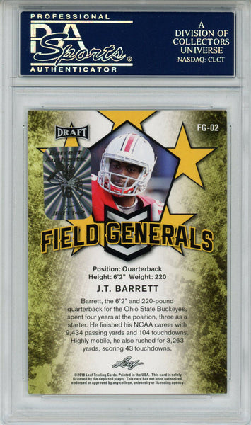 J.T. Barrett Autographed 2018 Leaf Draft #FG-02 Trading Card PSA Slab 43781 The number in the listing title is just an inventory sku for our records and is not the authentication number. This is the exact item that you will receive so please see pictures for condition. This is a trading card that was personally autographed by JT Barrett. This has been professionally slabbed by Professional Authentication Services (PSA) and includes a certificate of authenticity from Denver Autographs.