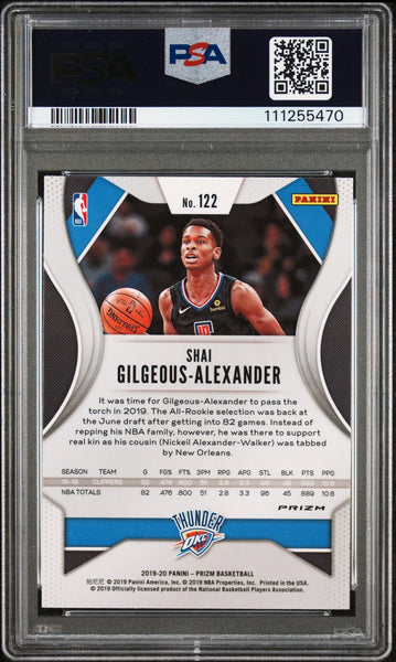 This Autographed Auto Graded Mint 9! 2019 Panini Prizm Red White & Blue #122 Card has been Personally Signed by Shai Gilgeous-Alexander of the Oklahoma City Thunder. This item is 100% Authentic, it comes slabbed and authenticated by PSA/DNA. The authenticity can be verified on Professional Sports Authenticator website.