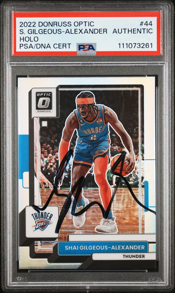 This Autographed 2022 Donruss Optic Silver Holo #44 Card has been Personally Signed by Shai Gilgeous-Alexander of the Oklahoma City Thunder. This item is 100% Authentic, it comes slabbed and authenticated by PSA. This item is not autographed. The authenticity can be verified on Professional Sports Authenticator website.