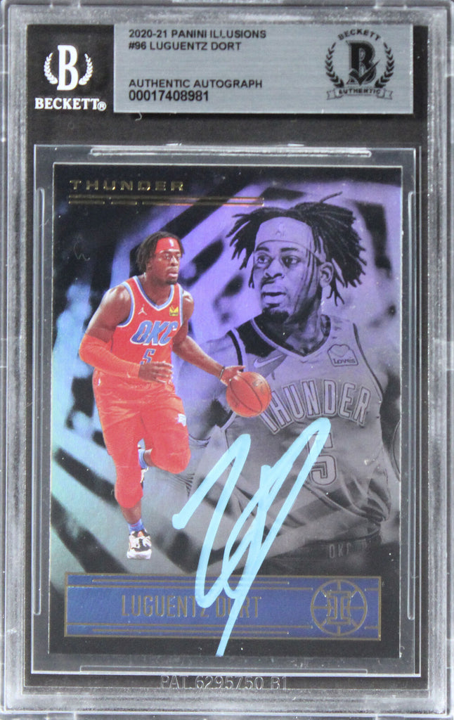 This Autographed 2020 Panini Illusions #96 Card has been Personally Signed by Luguentz Dort of the Oklahoma City Thunder. This item is 100% Authentic, it comes slabbed and authenticated by Beckett Authentication Services. The authenticity can be verified on Beckett Authentication Services website.