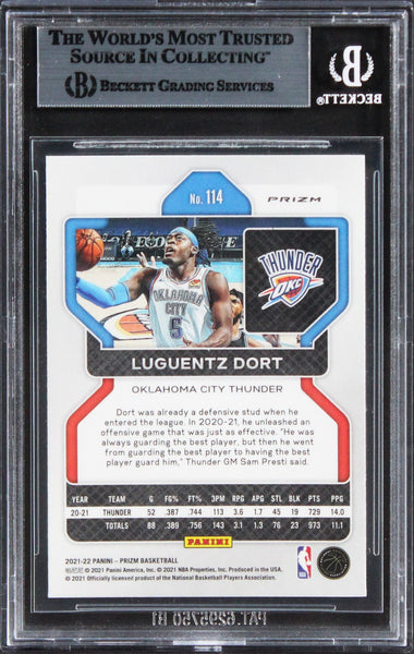 This Autographed 2021 Panini Prizm Prizms Green #114 Card has been Personally Signed by Luguentz Dort of the Oklahoma City Thunder. This item is 100% Authentic, it comes slabbed and authenticated by Beckett Authentication Services. The authenticity can be verified on Beckett Authentication Services website.