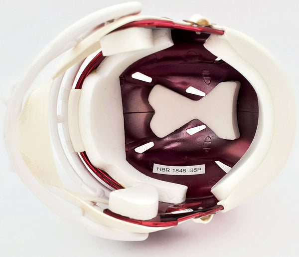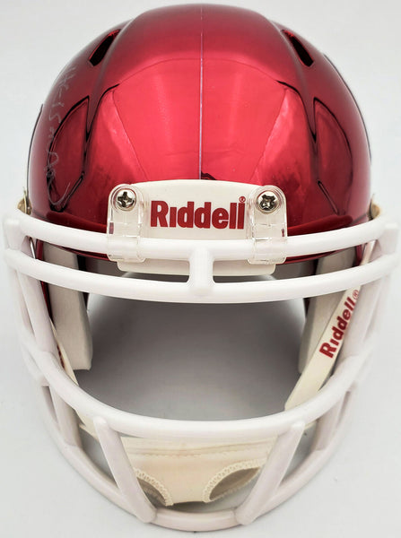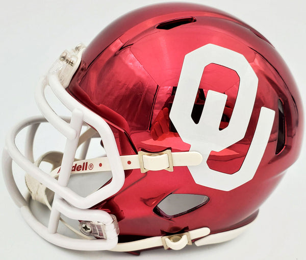 This is an Oklahoma Sooners Chrome Speed Mini Helmet that has been hand signed by Billy Sims. This item has been certified authentic by Beckett Authentication (BAS) and comes with their serial numbered sticker and matching certificate of authenticity. NOTE: The chrome helmets have a tag on them reading: "Due to the vacuum-metallization process used on the shell, your helmet may come with minor imperfections, which are unavoidable."