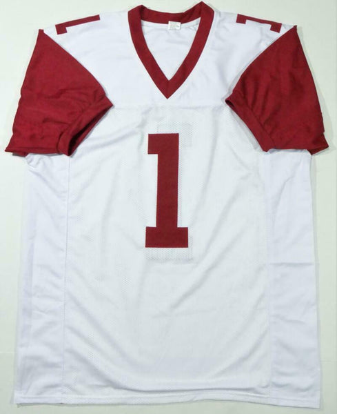Kyler Murray Autographed White College Style Jersey w/ HT - Beckett W Auth *1 THIS IS NOT AN NCAA JERSEY. THIS HAS NO TAGS, NO LOGOS, NO EMBLEMS. This is a hand autographed Jersey of Kyler Murray on a Custom Made (non name brand) Authentic Style Jersey with stitched letters and numbers. This item has a Beckett Witnessed Authentication, which comes with a numbered and a matching Beckett Certificate of Authenticity. You can view this item on the Beckett Authentication website, it shows when and where the item was signed. It was signed either at a public autograph appearance or a private signing. This is a stock photo of the item. Although you may not receive this exact item, the item you receive is virtually identical and brand new in great shape. Jersey size is XL.