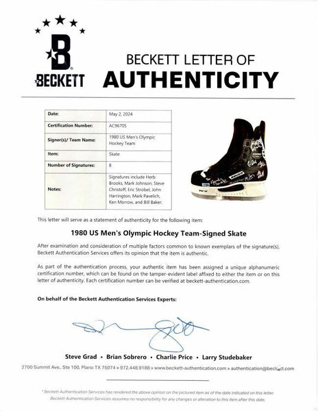 Featured is a 1980 USA Miracle On Ice team signed pair of Bauer Impact 100 hockey skates. These skates have been hand signed by Herb Brooks, Jim Craig, Mike Eruzione, Neal Broten, Phil Verchota, Ken Morrow, Steve Christoff, Jack O'Callahan (twice), Mark Pavelich, Steve Janaszak, Rob McClanahan, Bob Suter, Dave Christian, Eric Strobel, Mark Wells, Mark Johnson, Dave Silk, Mike Ramsey, Bill Baker, and John Harrington and comes with the Beckett holograms and letters of authenticity. These skates would make a great addition to any sports memorabilia collection! SPECIFICATIONS Autographed By: Team: USA Sport: Hockey Authentication: Beckett Grading Services