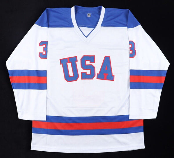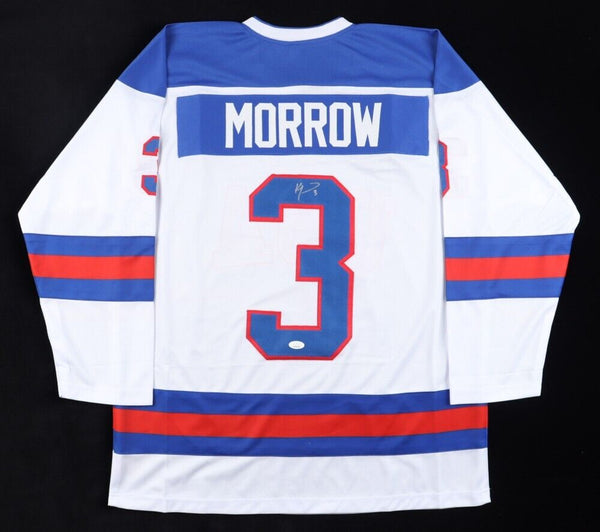 Custom on-ice style jersey. Everything is sewn on, size XL. Hand-signed by Ken Morrow.The autograph includes an official James Spence Authentication (JSA) hologram with matching COA for authenticity purposes. The signing of this item was witnessed by JSA.Authentication: JSA COA