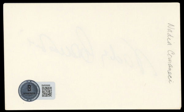 This Autographed 3x5 Index Card has been Personally Signed by Nadia Comaneci. This item is 100% Authentic to include a hologram by Beckett Authentication Services. This item will come with an affixed Beckett Authentication Services (BAS) authentication sticker, which includes a scannable QR code to verify authenticity. Please note that Beckett no longer provides serial-numbered COA cards, and the attached BAS sticker will serve as the complete authentication for this item. The authenticity can be verified on Beckett Authentication Services website.