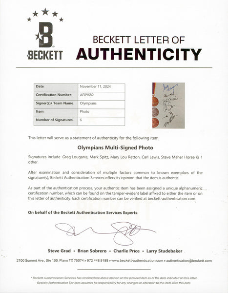 This Autographed 8x10 Photo has been Personally Signed by Greg Louganis, Mark Spitz, Mary Lou Retton, Carl Lewis, Steve Maher Horea +1. This item is 100% Authentic to include a Certificate of Authenticity (COA) / hologram by Beckett Authentication Services. The authenticity can be verified on Beckett Authentication Services website.
