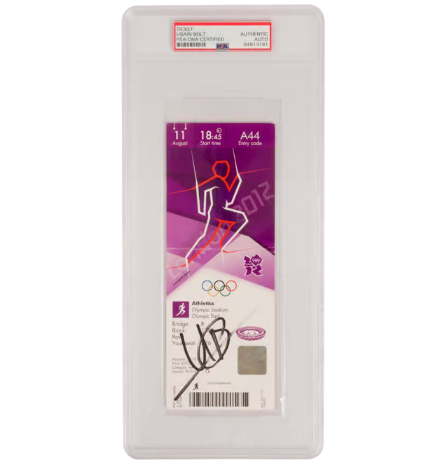 This is a Usain Bolt Signed 2012 London Olympics Ticket August 11 - PSA Authentic. THE ITEM IN THE PICTURE IS A STOCK IMAGE. YOU WILL RECEIVE AN IDENTICAL ITEM OF EQUAL QUALITY. ALL JERSEYS ARE SIZE LARGE. Every item of signed memorabilia we sell is official and of the highest quality. We pride ourselves on providing sports fans with the most exclusive signed memorabilia on the market. We are an industry leading signed memorabilia company who can guarantee 100% authenticity on every signature we sell. The item you receive will be identical to the one you are seeing in the stock pictures. This includes the item, the authentication company, signature color and signature placement. We take pride in ensuring the authenticity of all our items. With unwavering commitment, we guarantee that every signature is 100% authentic. Every item of signed memorabilia comes with a scannable barcode which takes you to the certificate of authenticity on the company's website. These industry leading authentication companies include Beckett Authentication Services, James Spencer Authentication Services and Professional Sports Authentication Services.
