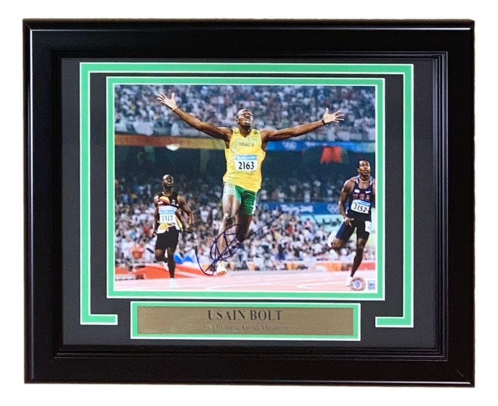 Featured is an Usain Bolt signed 8x10 Olympics photo. This photo has been hand signed by Bolt and comes with the Beckett hologram and certificate of authenticity. This photo has been professionally framed and matted and is approximately 11x14.. SPECIFICATIONS Autographed By: Usain Bolt Team: Sport: Racing Authentication: Beckett Grading Services