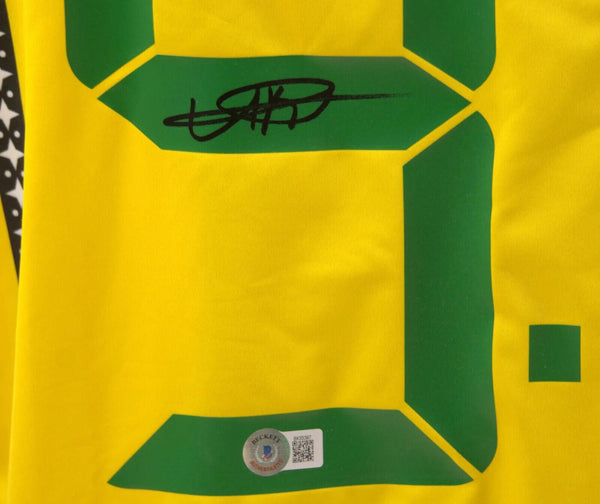 This is a Usain Bolt Signed Jamaica 9.58 World Record Olympic Jersey with Beckett COA. THE ITEM IN THE PICTURE IS A STOCK IMAGE. YOU WILL RECEIVE AN IDENTICAL ITEM OF EQUAL QUALITY. ALL JERSEYS ARE SIZE LARGE. Every item of signed memorabilia we sell is official and of the highest quality. We pride ourselves on providing sports fans with the most exclusive signed memorabilia on the market. We are an industry leading signed memorabilia company who can guarantee 100% authenticity on every signature we sell. The item you receive will be identical to the one you are seeing in the stock pictures. This includes the item, the authentication company, signature color and signature placement. We take pride in ensuring the authenticity of all our items. With unwavering commitment, we guarantee that every signature is 100% authentic. Every item of signed memorabilia comes with a scannable barcode which takes you to the certificate of authenticity on the company's website. These industry leading authentication companies include Beckett Authentication Services, James Spencer Authentication Services and Professional Sports Authentication Services.