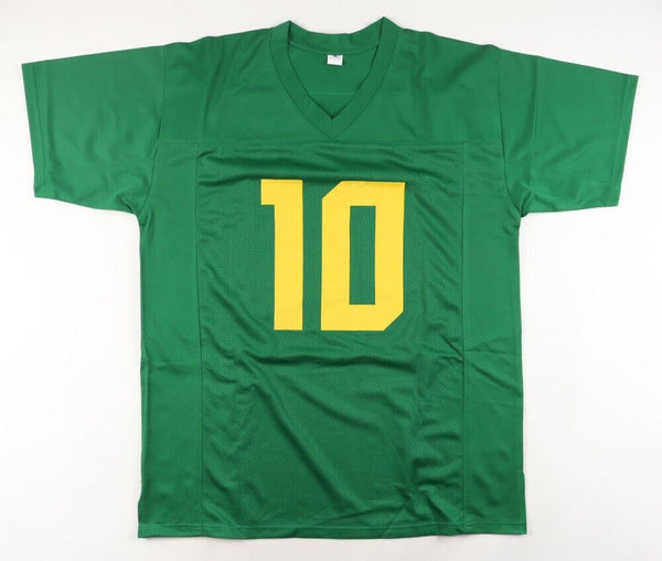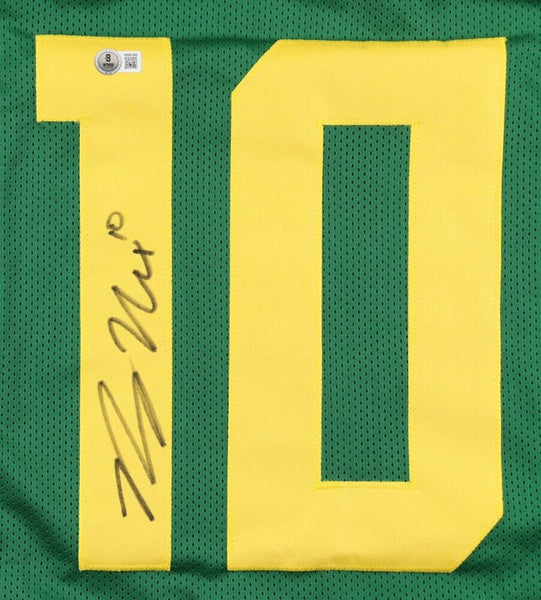 Custom on-field style jersey with everything sewn on, size XL. Hand-signed by Bo Nix.The autograph includes an official Beckett Authentication Services serially numbered hologram and QR Code card for authenticity purposes. The signing of this item was witnessed by Beckett.Authentication: Beckett Hologram with QR Code card