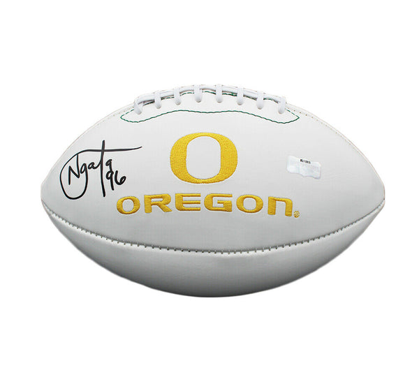 An Oregon Ducks Embroidered White NCAA Football hand signed by Haloti Ngata. The item and signature are in excellent condition. Haloti was drafted into the NFL in 2006 Round:1,Pick:12. Haloti a Super Bowl champion (XLVII). Haloti 2xFirst-team All-Pro (2010,2011). Haloti 3xSecond-team All-Pro (2008,2009,2012). Haloti 5xPro Bowl (2009-2013).AUTHENTICATION: This item is accompanied by a Certificate of Authenticity - Serial Numbered and Databased Hologram - Picture of Haloti from the Signing