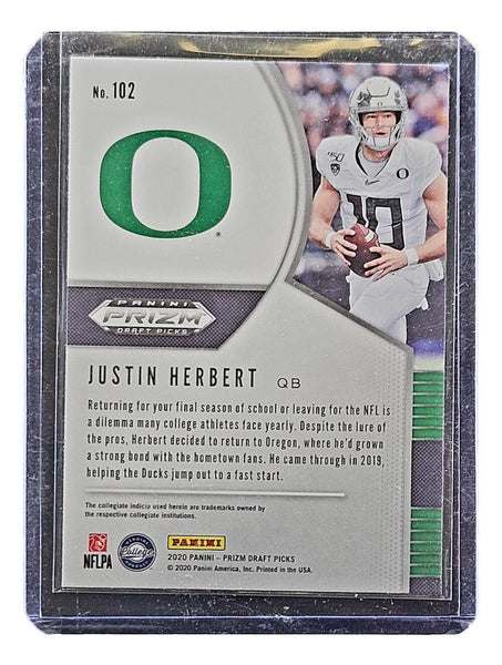 Featured is a Justin Herbert 2020 Panini Prizm Draft Picks #102 Rookie Card. This trading card would make a great addition to any sports memorabilia collection!. SPECIFICATIONS Autographed By: Team: Oregon Ducks Sport: Football Authentication: Beckett Grading Services