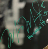 Marcus Mariota Signed "Dropback" Metallic 20 x 24 Photograph Inscribed "Heisman 14" - Steiner Sports Authenticated - Limited Edition 14 of 14 This is a Super Sports Center exclusive and cannot be found anywhere else. Photo measures 20" x 24" in size and has been hand signed and inscribed in green paint pen by Marcus Mariota (Titans). Limited edition hand numbered to 14. Marcus Mariota is an American football quarterback who was drafted by the Tennessee Titans second overall in the 2015 NFL draft. He played college football at Oregon, where he became the first Oregon player and Hawaii-born athlete to ever win the Heisman Trophy. Considered by many to be a Heisman Trophy favorite entering the 2014 season, Mariota was named to watch lists for the Maxwell Award, Walter Camp Award and Davey O'Brien Award. Prior to the start of the 2014 season, Mariota was considered one of the best prospects for the NFL draft. In May 2015, Mariota had the best-selling NFL jersey in the league, beating out the first overall pick, Jameis Winston, and Tom Brady who had the #2 and #3 selling jerseys respectively. Playing his first career regular season game on September 13, 2015 in Week 1 against the 2015 first overall draft pick Winston and the Tampa Bay Buccaneers, Mariota threw for 209 yards and four touchdowns in a 42-14 victory. In that game, Mariota gained a perfect passer rating of 158.3, making him the first quarterback in NFL history to attain a perfect passer rating in his first regular season game. Mariota became the first quarterback in NFL history to throw four touchdown passes in the first half of his NFL debut. He is also the youngest quarterback to reach the perfect passer rating (21 years, 318 days), surpassing Robert Griffin III. The autograph includes an official Steiner hologram and matching COA for authenticity purposes. Authentication: Steiner COAThis photograph is limited to only 14 and individually numbered.Winning bidder will receive number "14" from the edition.