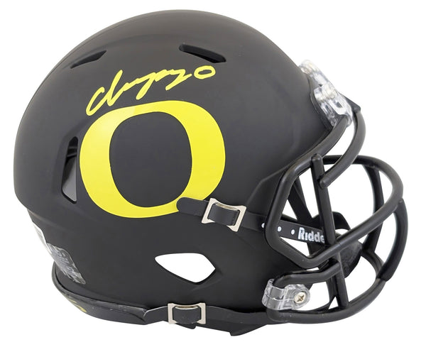 This Autographed Black Speed Mini Helmet W/ Uv Mirrored Back Acrylic Display Case has been Personally Signed by Christian Gonzalez of the Oregon Ducks. This item is 100% Authentic to include a hologram by Beckett Authentication Services. This item will come with an affixed Beckett Authentication Services (BAS) authentication sticker, which includes a scannable QR code to verify authenticity. Please note that Beckett no longer provides serial-numbered COA cards, and the attached BAS sticker will serve as the complete authentication for this item. This is a BAS Witnessed Protection Program item which means a Beckett Authentication Service representative was present when this item was being signed. We conducted an autograph signing with Christian Gonzalez where multiples of the same item were signed. While the photographs are representative of this item, the size, placement and strength of the signature may vary. Each item is hand signed, therefore, each autograph is unique. This item can be verified through BAS Witnessed.