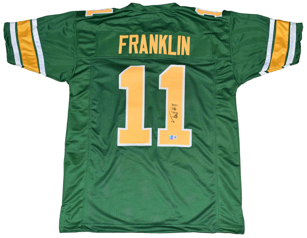 Troy Franklin, star wide receiver for the Oregon Ducks, has hand signed this throwback custom jersey at a private signing. Jersey is size XL and all letters/numbers are sewn-on. This item is authenticated by Beckett Authentication Services and was signed in the presence of one of their representatives. Their tamper-evident hologram featuring a QR code and serial number is on the item. The authenticity can be verified online by entering the serial number or scanning the QR code.Item pictured may not be the exact item you will receive. It will be similar quality, and we guarantee your satisfaction.