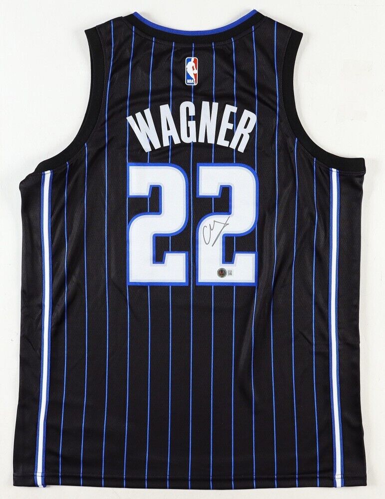 Custom On-court Nike Replica jersey. Everything is pressed on, size 48 (adult Large). Has been hand-signed by Franz Wagner.The autograph includes an official Beckett Authentication Services serially numbered hologram for authenticity purposes. The signing of this item was witnessed by Beckett.Authentication: Beckett Hologram