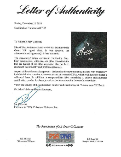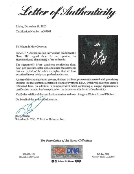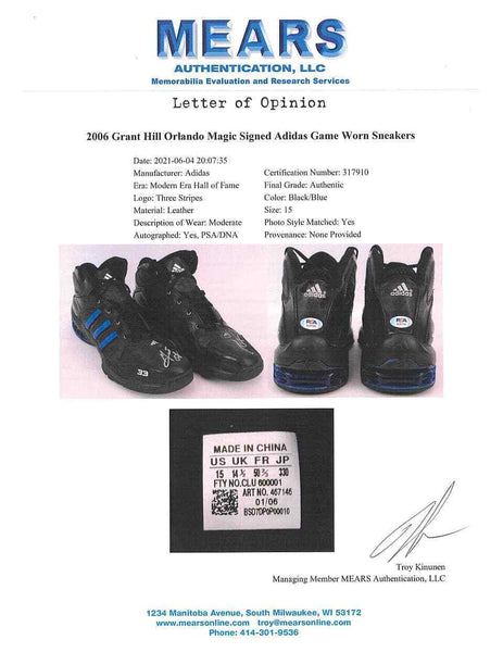 Featured is a Grant Hill signed Orlando Magic 2006 game used pair of sneakers. These shoe has been hand signed by Hill and comes with the PSA hologram and letter of authenticity, along with the Mears letter of authenticity. This shoe is size 15. These shoes would make a great addition to any sports memorabilia collection!. SPECIFICATIONS Autographed By: Grant Hill Team: Orlando Magic Sport: Basketball Authentication: Professional Sports Authenticator (PSA)