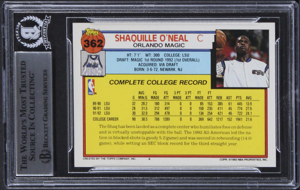 This Autographed 1992 Topps #362 Rookie Card has been Personally Signed by Shaquille O'Neal of the Orlando Magic. This item is 100% Authentic, it comes slabbed and authenticated by Beckett Authentication Services. The authenticity can be verified on Beckett Authentication Services website.