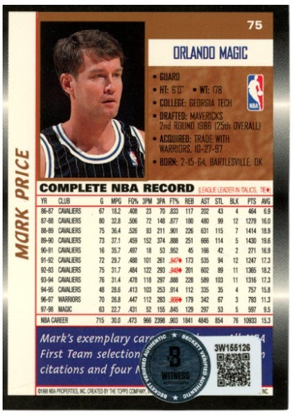 The number in the listing title is just an inventory sku for our records and is not the authentication number. The item pictured is the exact image you will receive, please see photos for condition. This is an Orlando Magic 1998-1999 Topps #75 Trading Card that was personally autographed by Mark Price. Includes a certificate of authenticity from Beckett Authentication Services (BAS) and Denver Autographs. FREE SHIPPING within the USA on orders over $10!