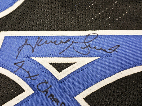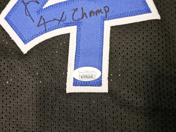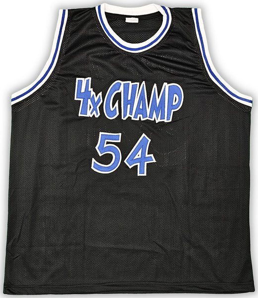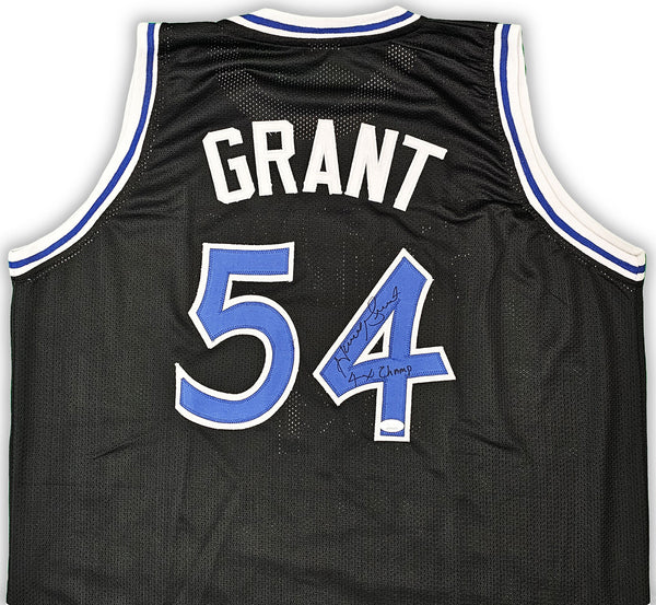 This is a Black Jersey that has been hand signed by Horace Grant. This is a custom jersey with no name brand. The approximate size is XL. It has nice sewn in name and numbers. This item was inscribed "4x Champs." This item has been certified authentic by JSA and comes with their tamper-proof sticker and matching certificate of authenticity.